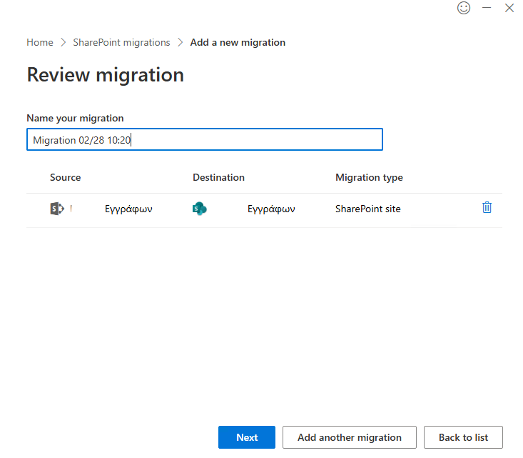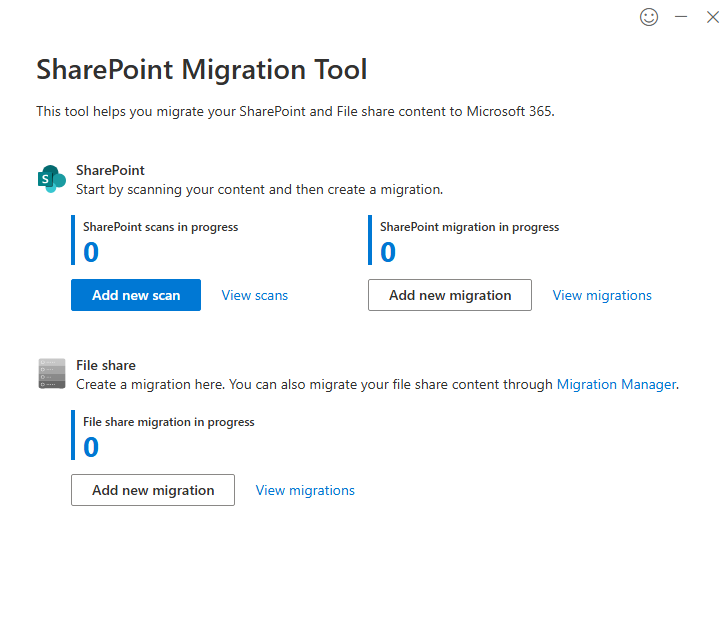 From the program, select "Add new migration" under the "SharePoint Migration in Progress" section.