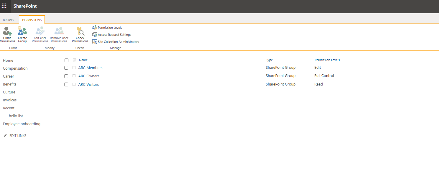 Note: The user must have Administrator rights to have a full overview of permission management for the site.