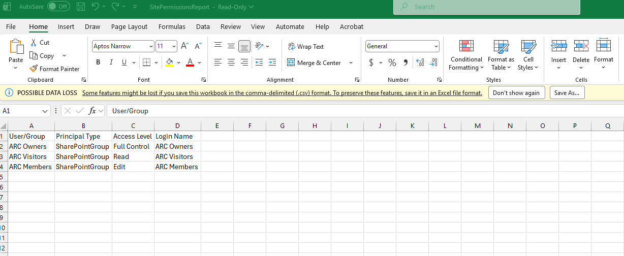 On the next page, as you can see, the SharePoint groups, Active Directory groups, and individual users with access are displayed, along with their specific permission levels. Crucially, the standard interface does not offer an "Export to Excel" option for this data.