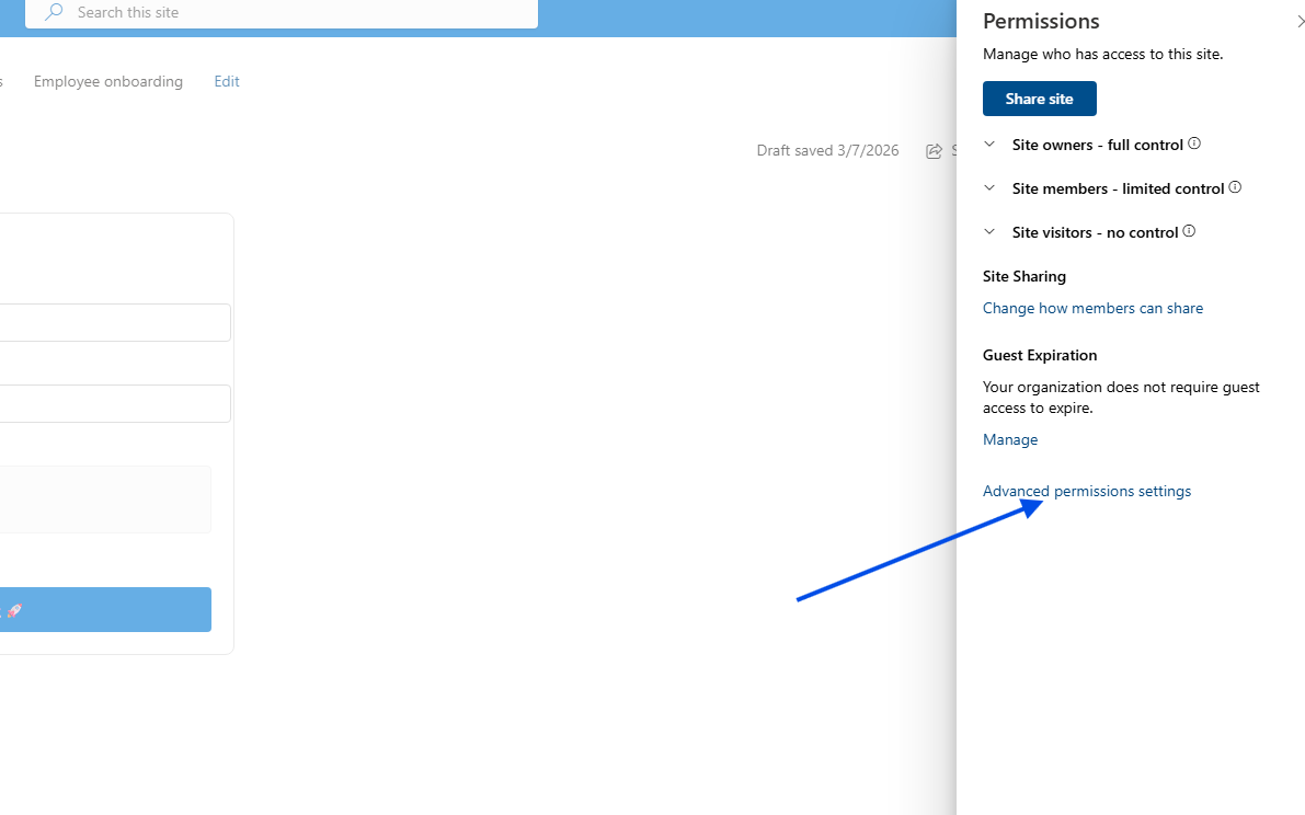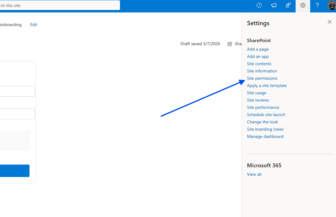 Access Site Permissions: Navigate to your chosen site, click the gear icon in the top right, and select Site permissions.