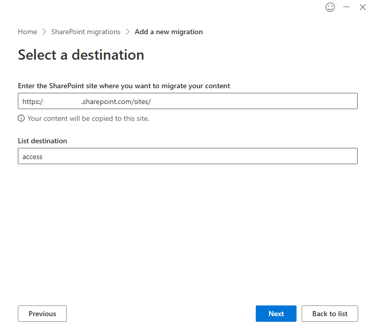 Enter the destination site in the Online environment and the name for the list. By default, it uses the name from the on-premises environment.