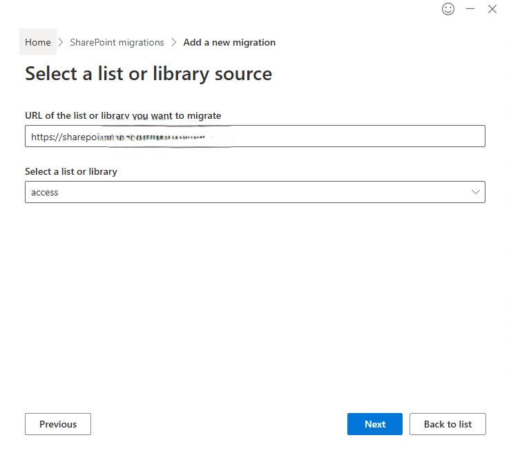 Enter the URL of the on-premises environment hosting the list and resolve the specific list you want to migrate.