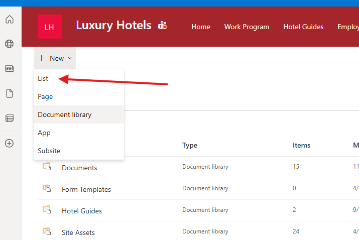 Create New List: Select New in the top left, then select List.