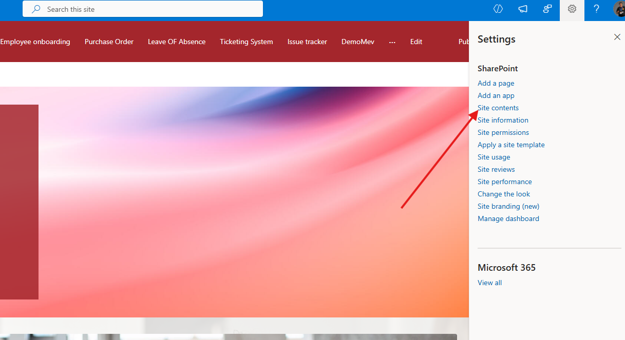 Access Site Contents: Locate the desired list. By clicking the gear icon (Settings) in the top right corner and selecting Site Contents, you will be taken to the page displaying all content for that specific site.