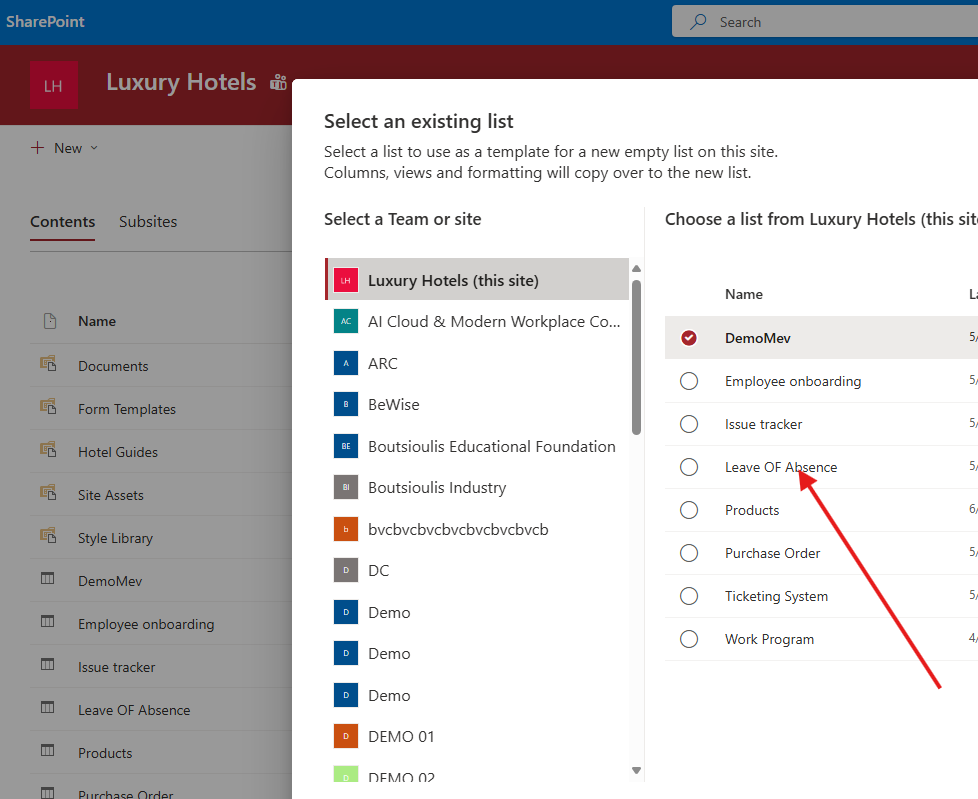 Select Source: In the next step, select the list you wish to use as a template and click OK.