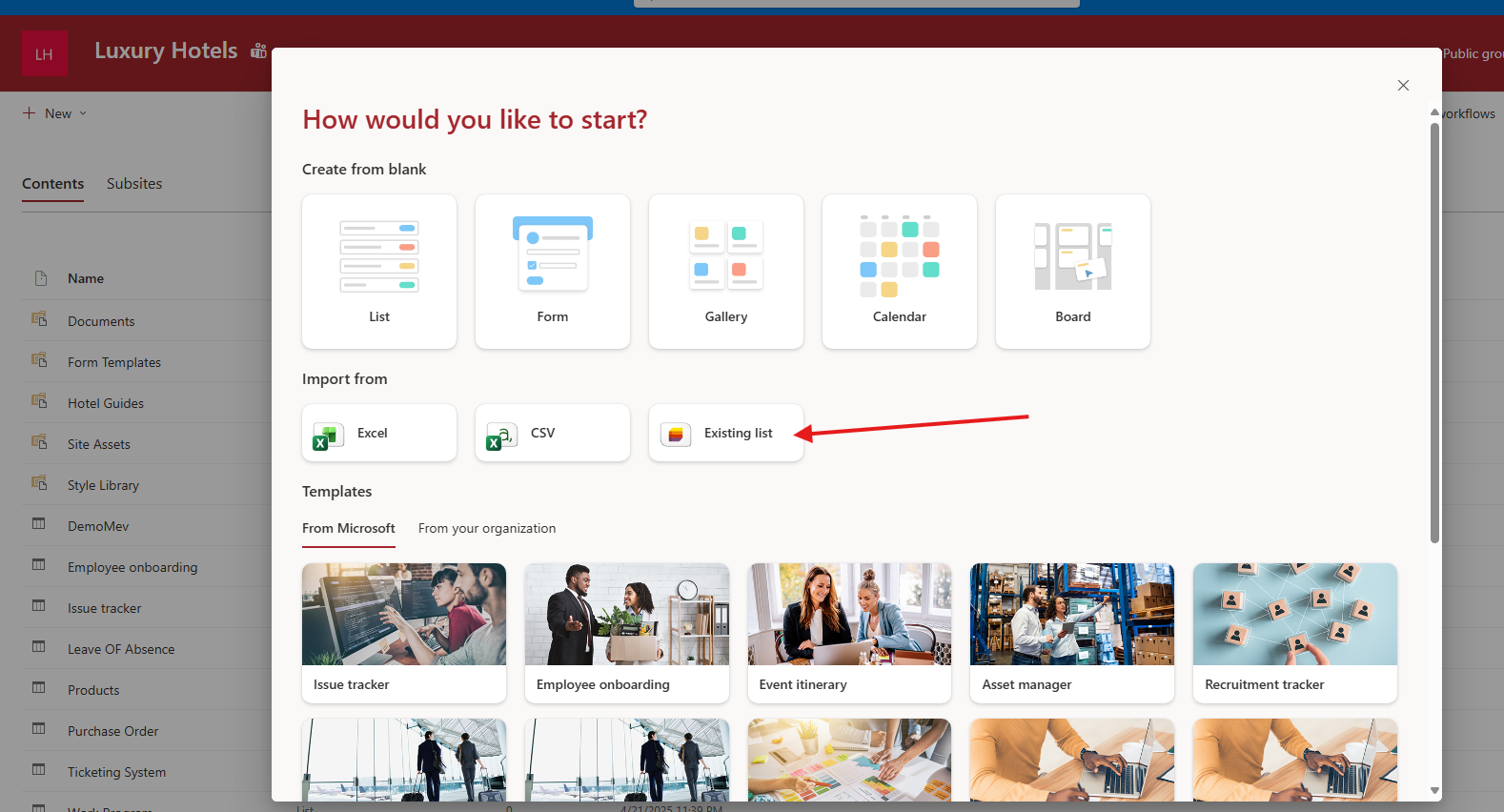 Template Selection: Choose the From existing list option.