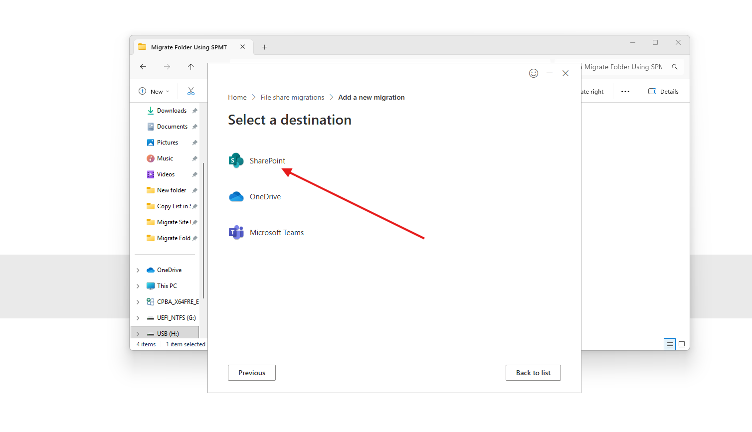 Destination Selection: Select SharePoint as the destination.