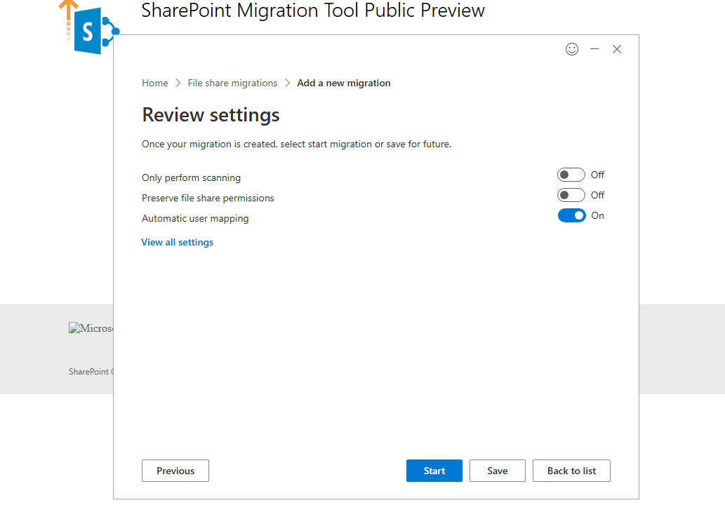 Review Settings: The next screen displays the Review Settings page. Use the toggles to enable or disable specific features for your migration.