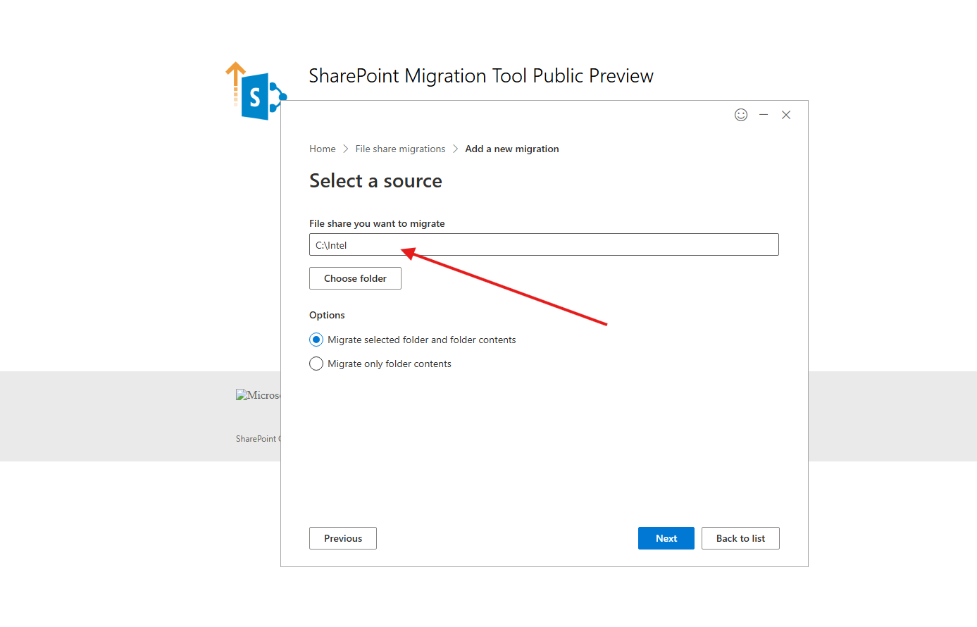 Configure Source: Choose Single file share source. Enter the URL for the folder you wish to migrate. At this stage, you have the option to migrate only the folder contents or both the folder and its contents. Click Next.