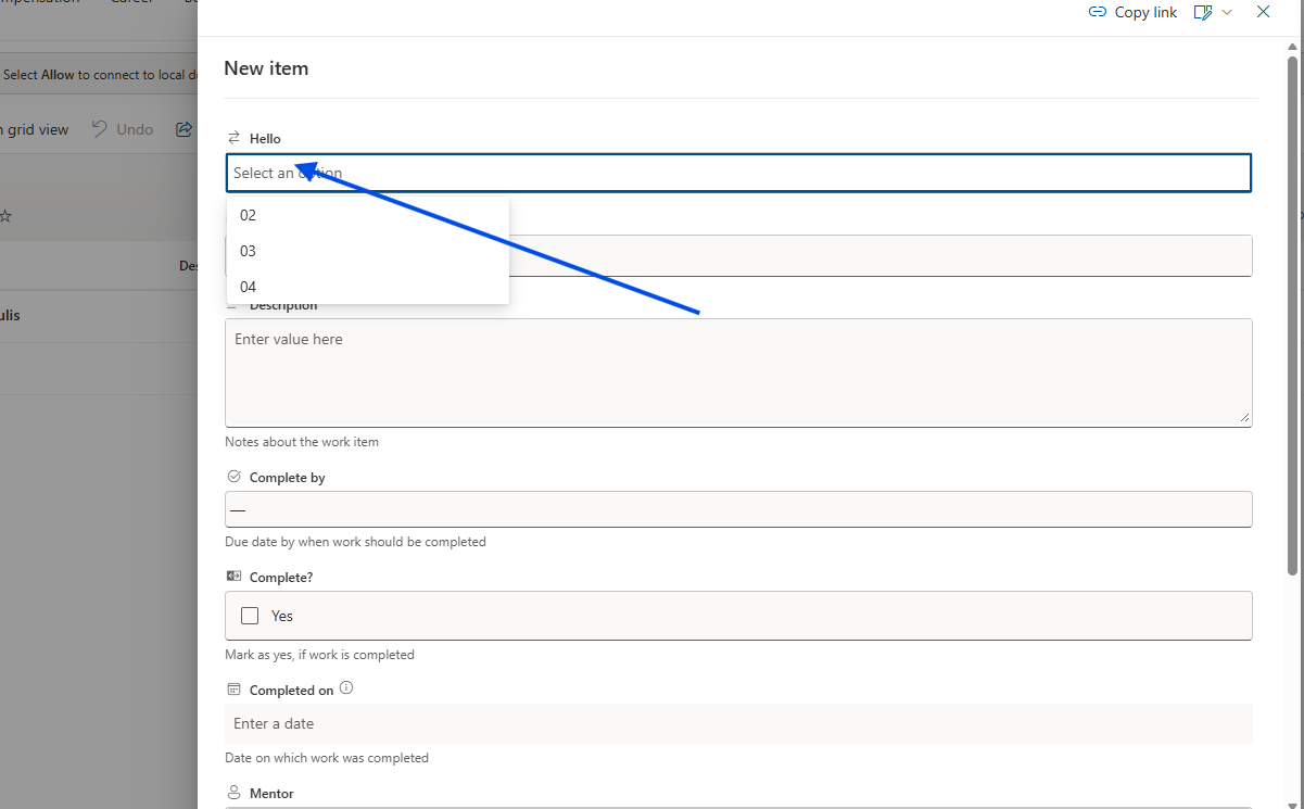 If we now decide to create a new item, we see in the form that the fields have been rearranged according to the order we have already set in Column ordering.