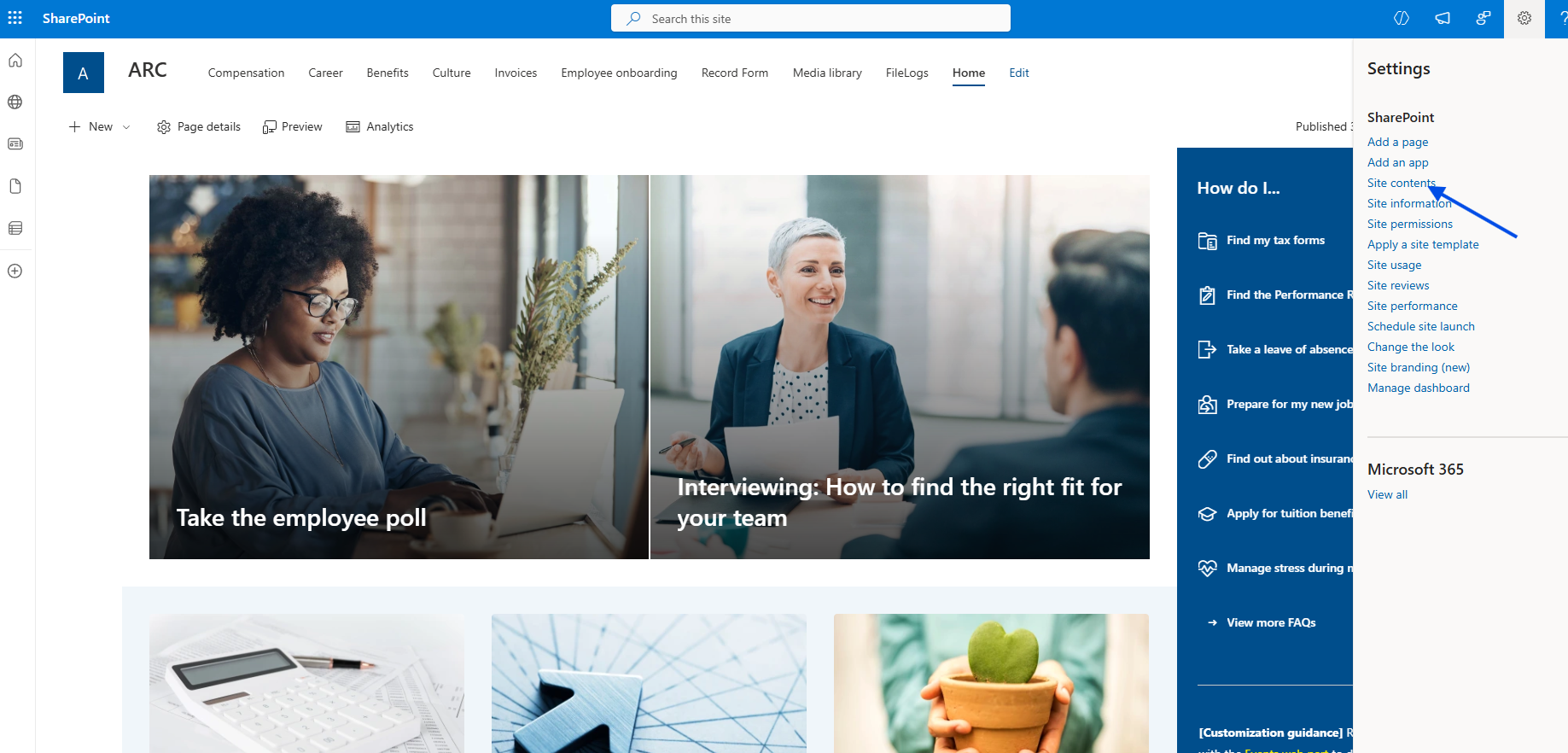 First, we select the site that hosts our list and from the gear icon at the top right we choose Site contents.