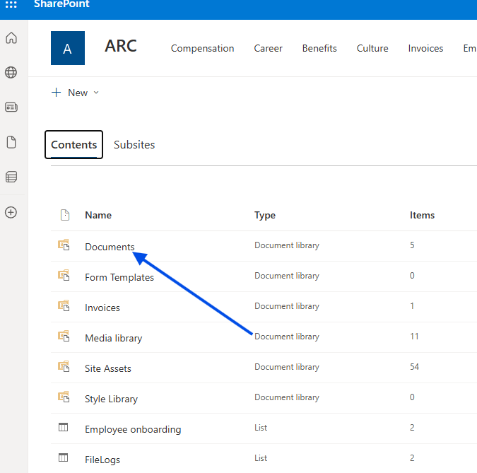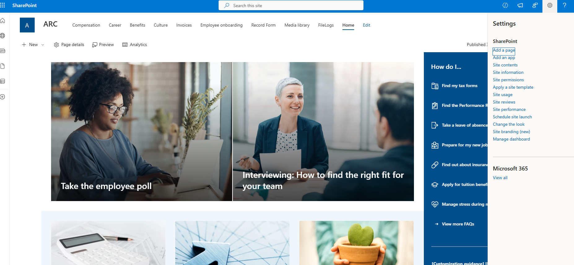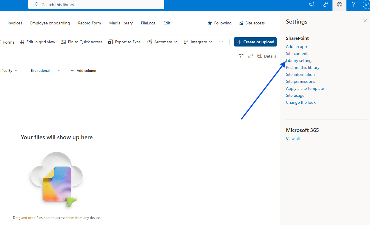 First, we need to navigate to the page that hosts the library and from the gear icon at the top right select Site contents.