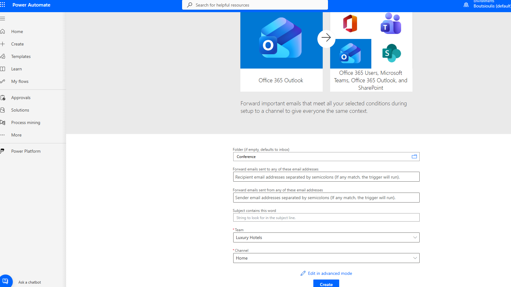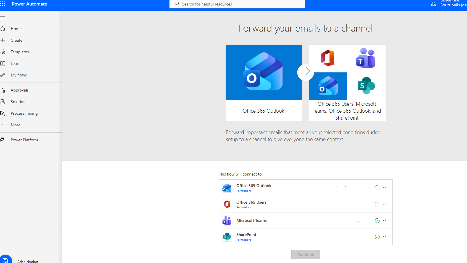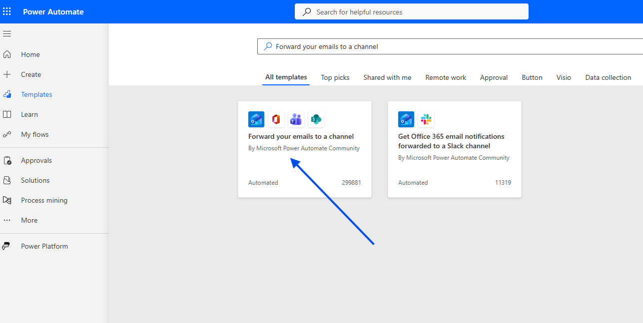 We type Forward your emails to a channel and select the ready-made template.