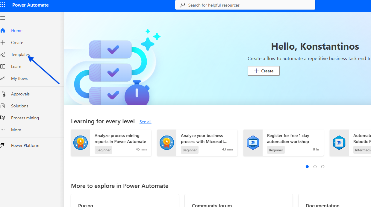 First, we go to the Power Automate page and select Templates.