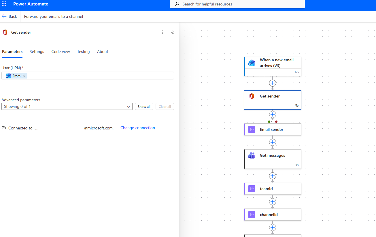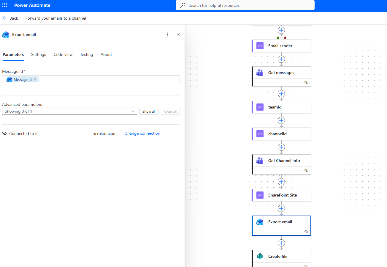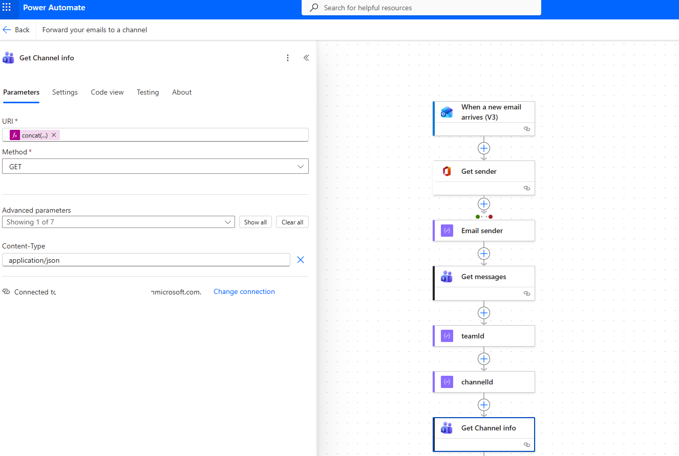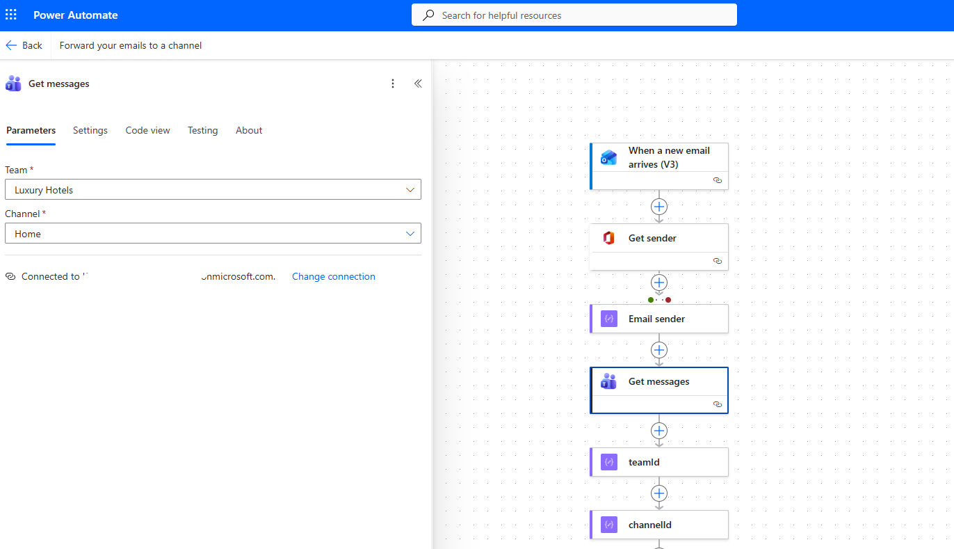 Then it selects Get messages, where we must enter the team and channel where we want the notification to be sent.