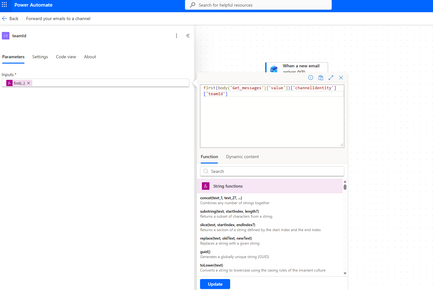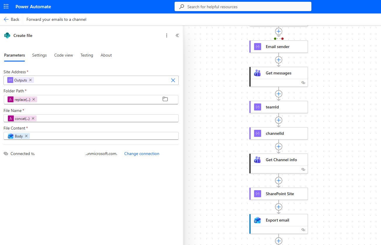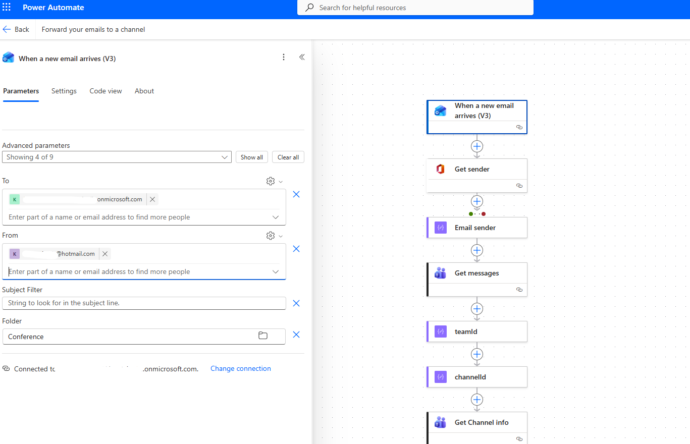Then it selects Get messages, where we must enter the team and channel where we want the notification to be sent.