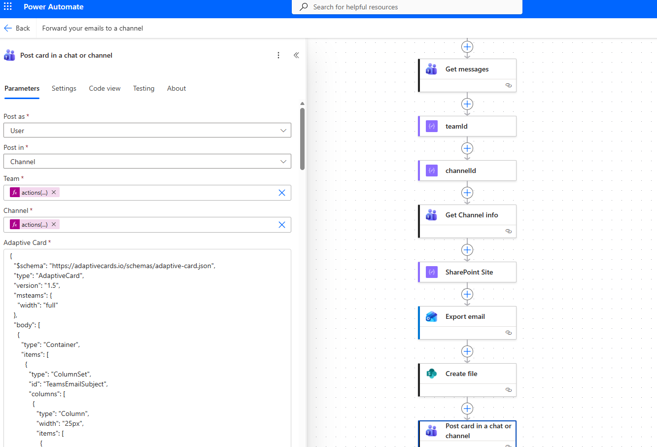 Then it generates the adaptive card using JSON, injecting dynamic values that were previously assigned to variables.