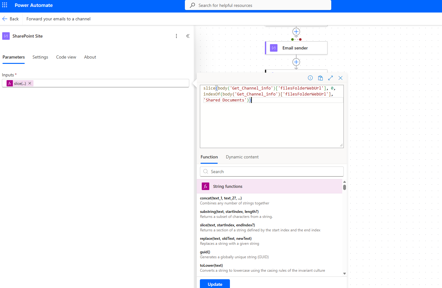 The next action assigns the SharePoint details to a variable.