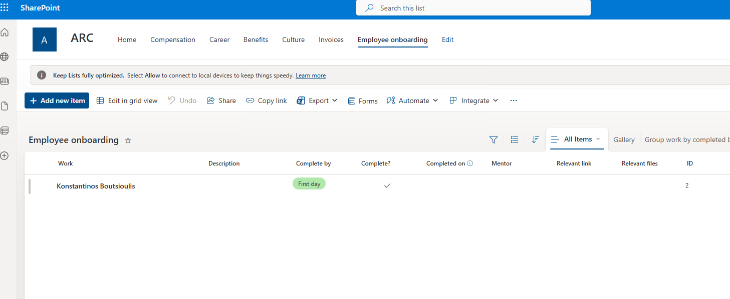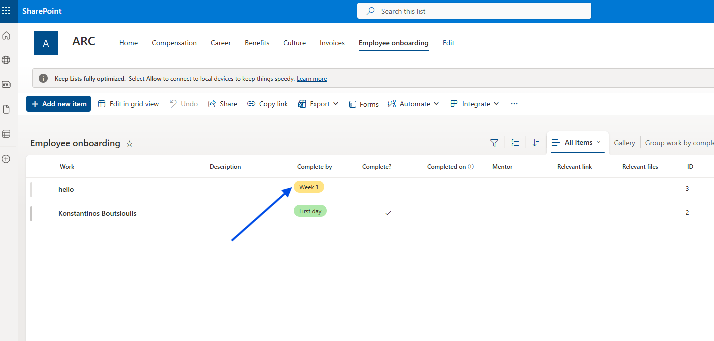 First, we select a list that has a Choice column—in this case, in the Employee Onboarding list, the Complete by column.