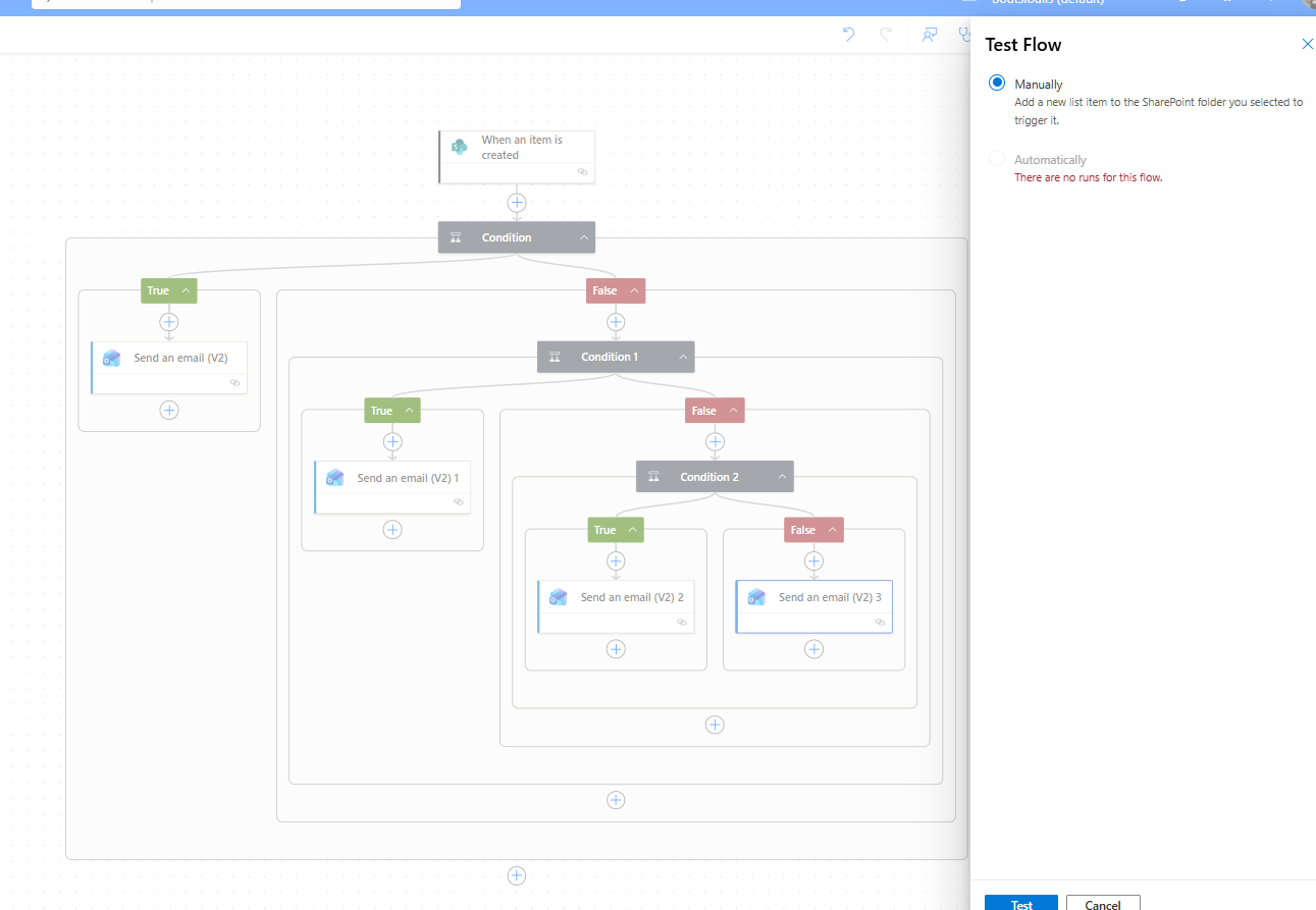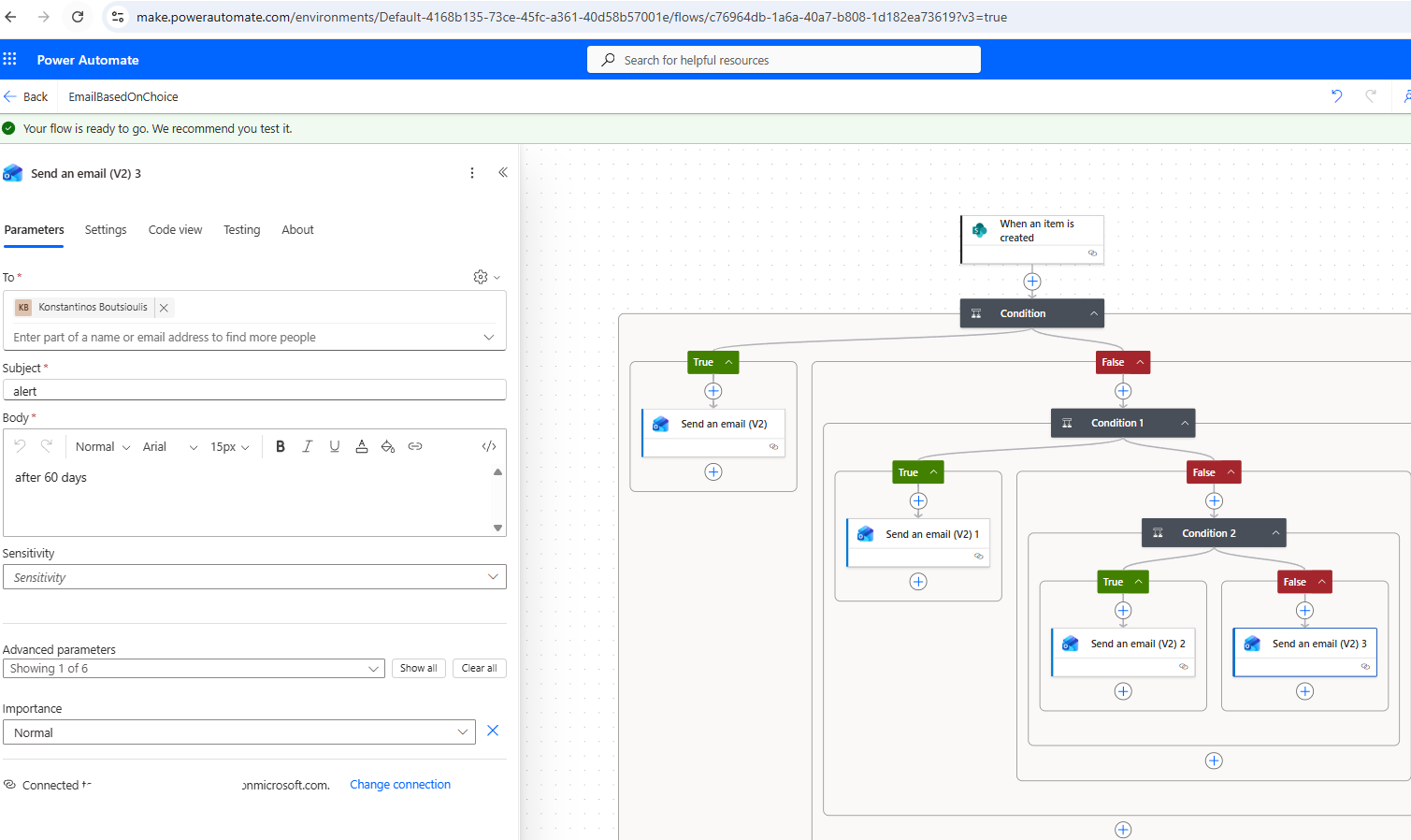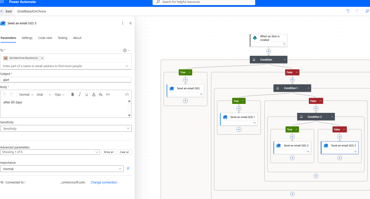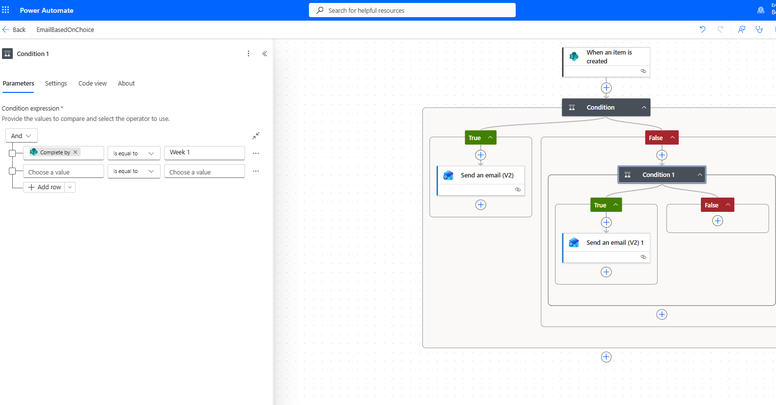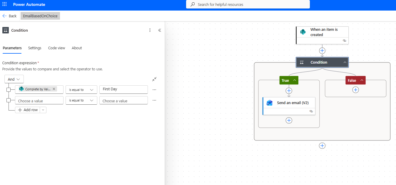 Then we add a Condition that dynamically reads the Complete by value; if it equals First Day, it will send an email to Recipient 01.